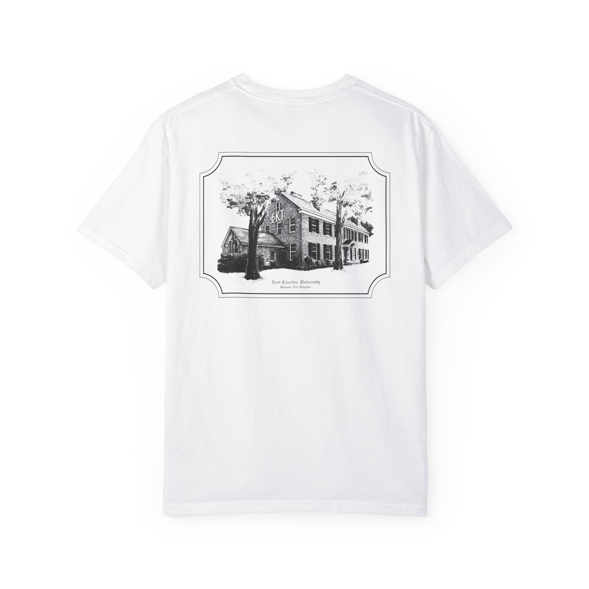 A classic Comfort Colors short-sleeve tee featuring an imprint of a drawing of the PKT house at East Carolina, perfect for those looking for a comfortable and stylish casual look. This garment-dyed unisex t-shirt is ideal for adults and comes in a range of sizes from S to 3XL, making it a versatile wardrobe staple. This tee offers long-lasting comfort and style.